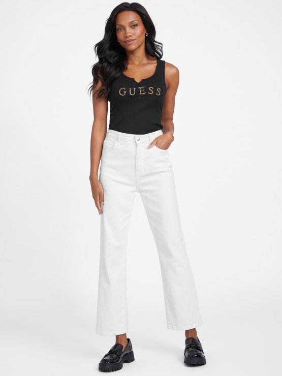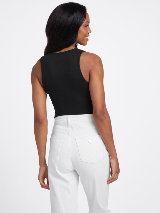 Predstavljajo V Tej Pleteni Majici Brez Rokavov Z Velikim Izrezom Z Zarezanim V-v In Dvignjenim Kovinskim Logotipom.