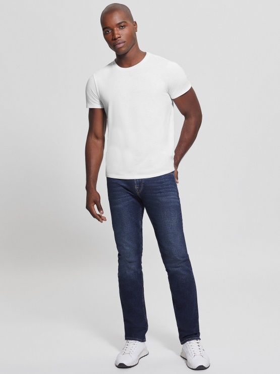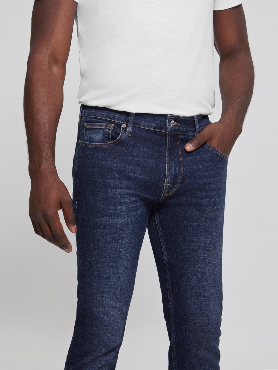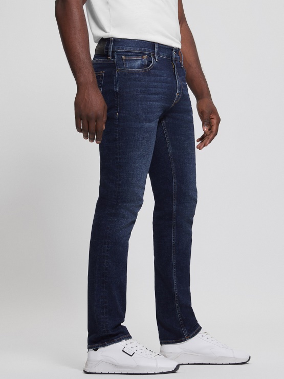 Ta Preizkušen In Resničen Par Temno Pranih Kavbojk Ima Ravne Hlače, Brke In Namerno Bledenje.