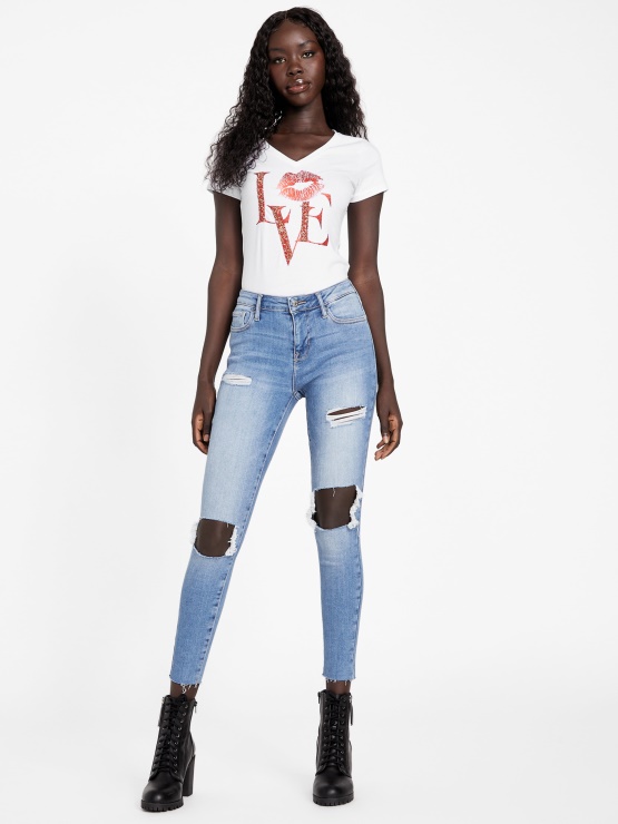 Zaljubite Se V To Majico S Kratkimi Rokavi, Ki Ima V-izrez Z Grafiko Ustnic In Besedilom Spredaj, Poudarjenim Z Detajli Iz Kamnitega Kristala In Kamenčkov. Uporablja Organsko Bombažno Vlakno.