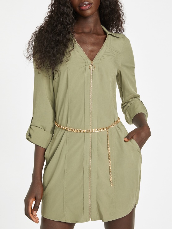 Zabavna Srajčna Obleka Challis Z Zapiranjem Na Zadrgo Spredaj, Zavihanim Ovratnikom, V-izrezom, Dolgimi Rokavi Z Zavihki In Srajčnim Robom. Priložen Verižni Pas.