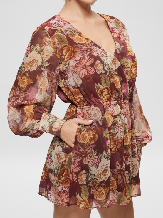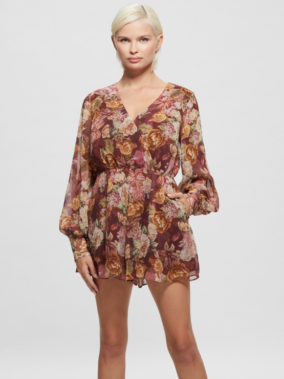 Go with romance in this crinkled-chiffon romper featuring an allover print, a surplice neckline, long balloon sleeves, elastic waist, front pockets, billowy shorts and a hidden back zipper. Contains recycled plastic.