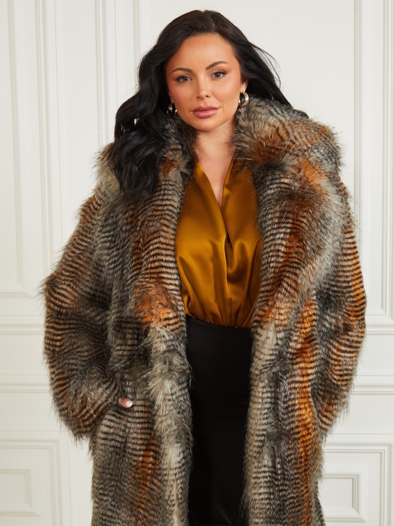 Oblecite Se V Fino Prefinjenost S Tem Plaščem Iz Umetnega Krzna. S Silhueto Parangala, širokim Ovratnikom, Namenoma Raztrganim Umetnim Krznom In Dizajnom živalskega Potiska.
