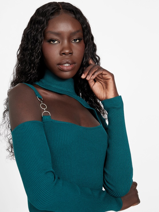 Pokažite Svojo Postavo V Tem Majici Z Izrezi. Z Rebrasto Izdelavo, Asimetričnim Izrezom, Verižico V Srebrnem Odtenku, želvo In Dolgimi Rokavi.