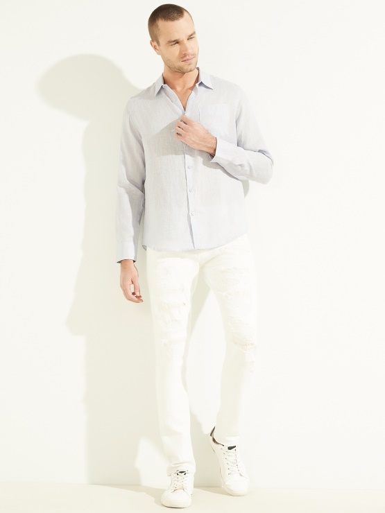 Lanena Srajca Z Zapiranjem Na Gumbe Spredaj, Zarezanim Ovratnikom In Ilustriranim Grafičnim Potiskom. Uporabljena Vlakna, Ki Varčujejo Z Vodo.