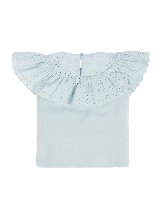 Lahek In Volan, Ta Svež Top Zanjo Je Oblikovan S Prevelikimi Naborki Iz Sangallo čipke Vzdolž Vratnega Izreza S Pletenim Ohišjem In Zapiranjem Z Gumbi Na Zadnji Strani.