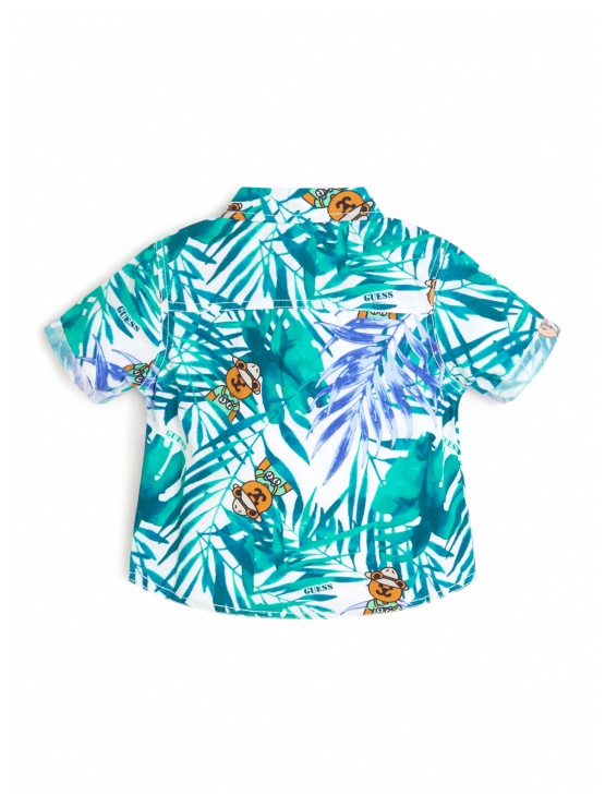 Kot Nalašč Za Tiste Raziskovalne Dni. Srajca Iz Poplina S Potiskom Listja In Medveda, Zavihanim Ovratnikom, Kratkimi Rokavi, Prsnim žepom In Srajčnim Robom. Zapiranje Na Gumb Spredaj.
